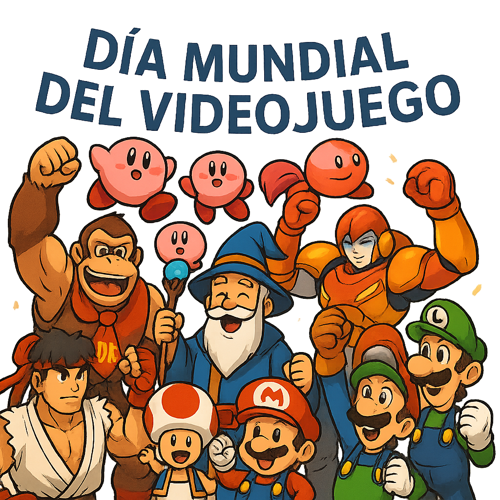 alt="Personajes de videojuegos como Mario, Kirby y Ryu celebrando el Día Mundial del Videojuego en una ilustración llamativa"