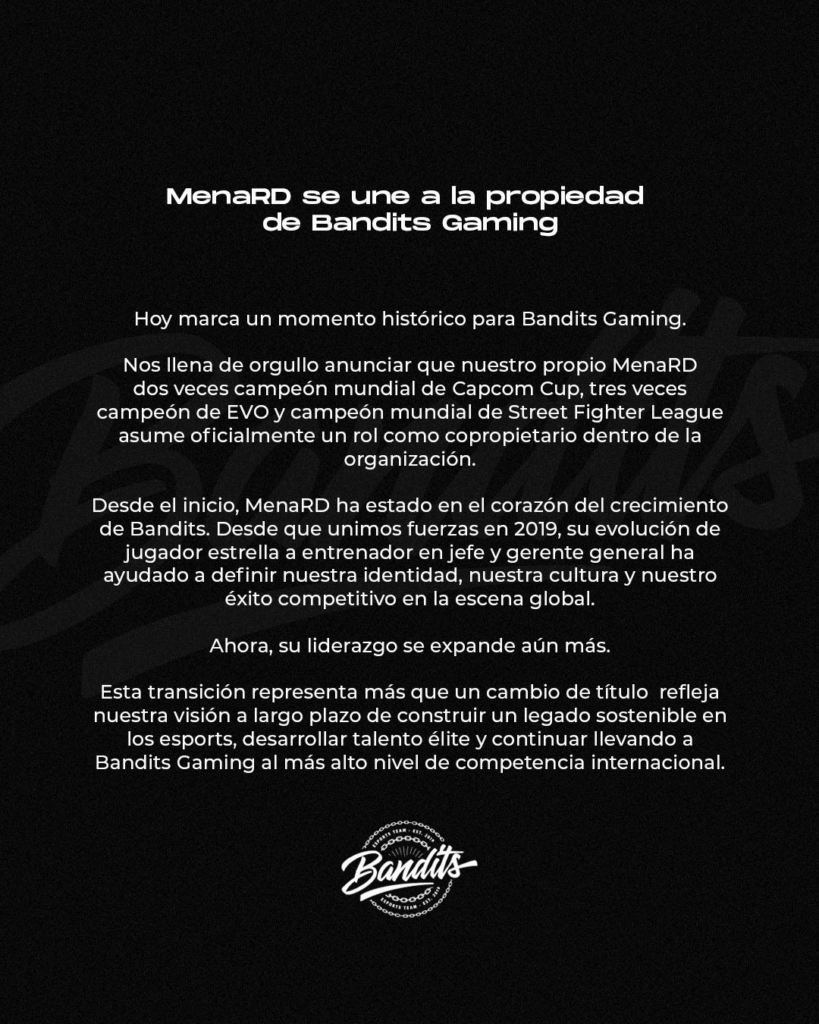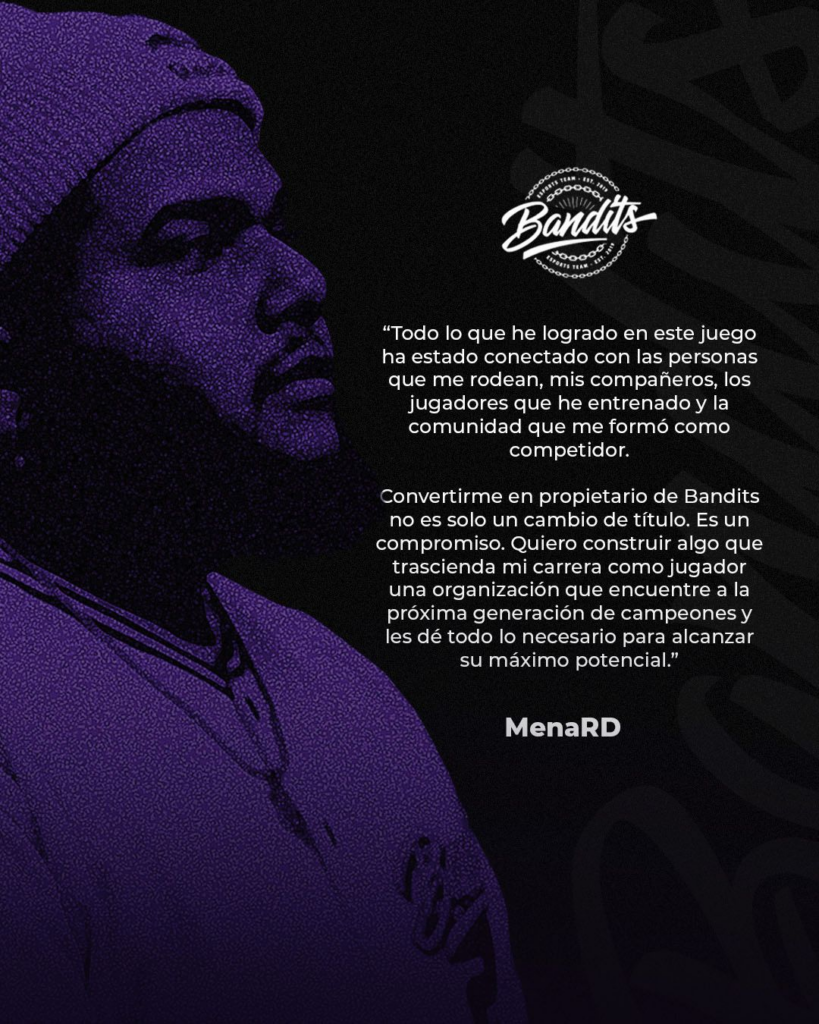Hoy, con MenaRD copropietario de Bandits Gaming, su liderazgo se formaliza en la estructura de propiedad, apuntando a fortalecer la sostenibilidad del proyecto y elevar el estándar de desarrollo para jugadores de alto rendimiento.